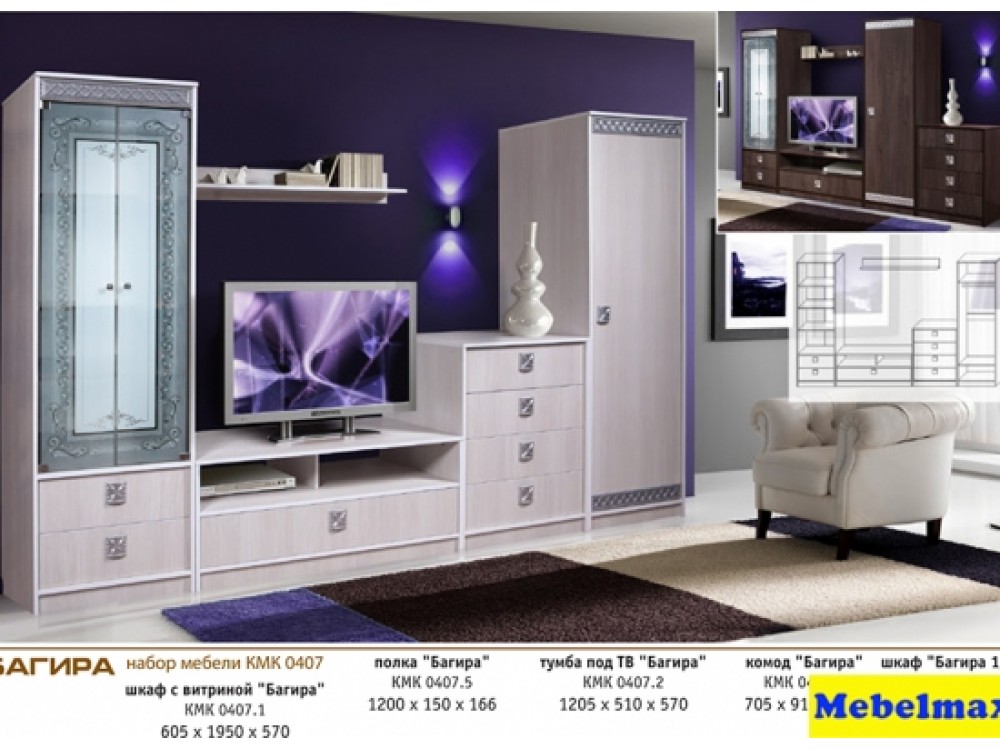 Набор предназначен для гостиной комнаты, которая должна быть и стильной и уютной и чувственной одновременно, всего этого можно достичь, выбрав мебель из модульной секции "Багира". Среди разных вариантов модулей можно легко выбрать наиболее подходящие экземпляры для каждого из которых есть своё назначение и создать индивидуальную обстановку в квартире. От количества и типов элементов зависит конечная стоимость. Набор многофункционален: здесь и шкаф для одежды и белья, и шкаф - витрина для посуды и множество ящиков, открытые полки для различных вещей, для книг, сувениров и рамок с фото. Совершенную геометричность форм дополняет оригинальное дизайнерское решение - нестандартное применение радиусных ручек, декора из полиуретана, рисунка на стеклоизделиях, всё это не оставит Вас равнодушным и увлечёт в мир гармонии.