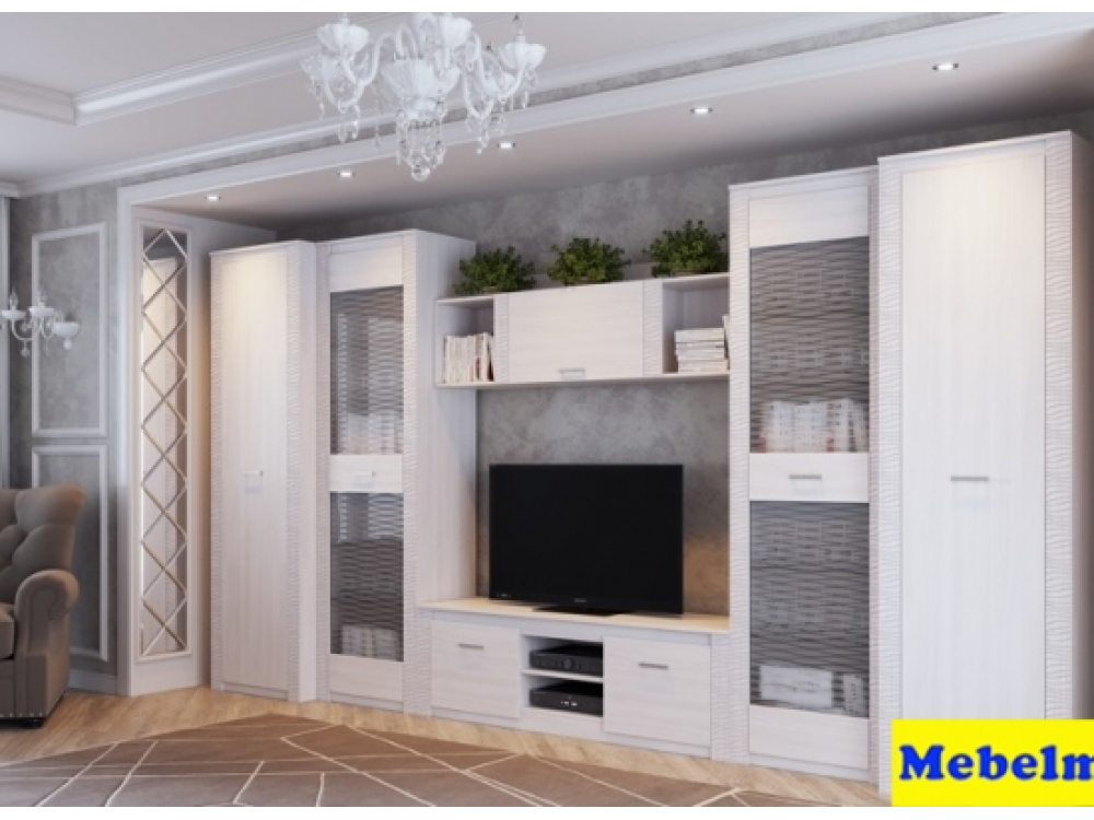 Оригинальная цветовая гамма в гостиной отличается от других наборови подчеркивает ее индивидуальность.Стеклянные двери,придают коллекции,особый вид,сохраняя при этом функциональность.максимально вместительная модульная гостиная изготовлена из качественной фурнитуры