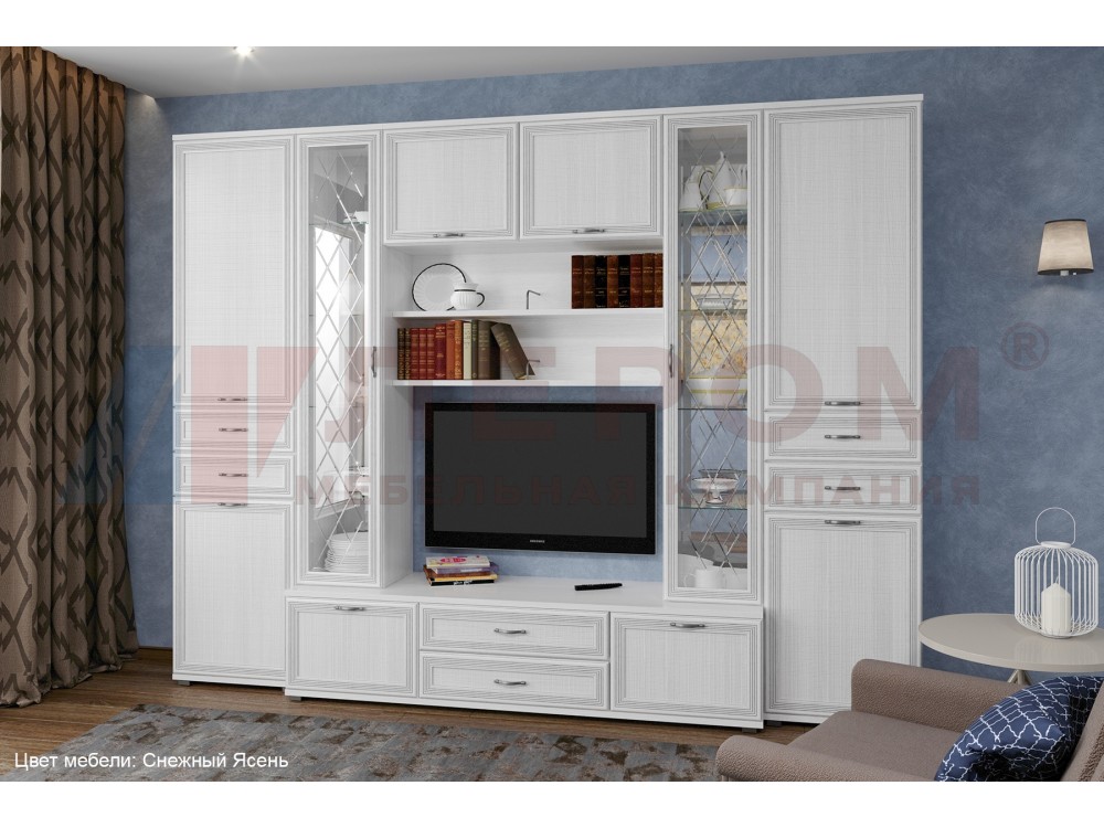 Применяемые материалы: корпус ЛДСП, фасад МДФ.Габаритные размеры: ВхШхГ - 2224х2880х448 мм. Размер ниши под телевизор: ВхШ - 800x1080 мм.Состав композиции по модулям: ШК-1045, ШК-1064, ТБ-1031, АН-1038, ПЛ-1004, ПЛ-1004, ШК-1064, ШК-1045, ЗР-1012, ЗР-1012.Композиция изготавливается в следующих цветовых вариантах:- Снежный ясень (СЯ)- Ясень Асахи (АС)- Гикори Джексон светлый (ГС)- Акация Молдау (АТ)