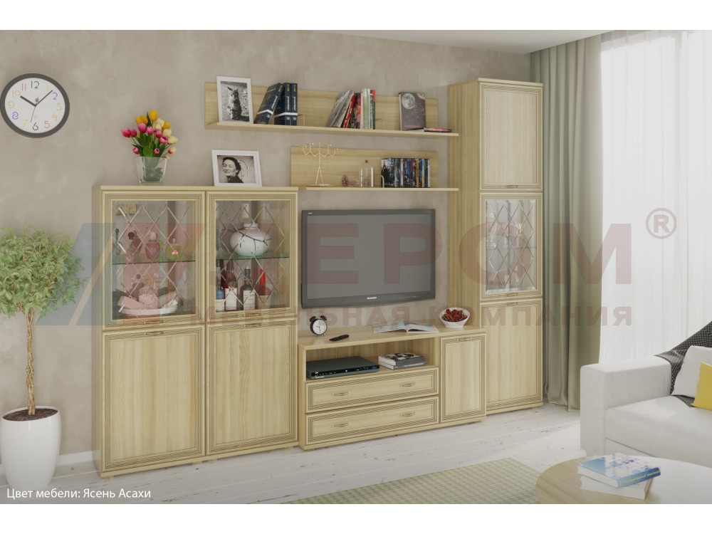 Применяемые материалы: корпус ЛДСП, фасад МДФ.Габаритные размеры: ВхШхГ - 2224х2880х448 мм. Размер ниши под телевизор: ВхШ - 1058x1260 мм.Состав композиции по модулям: ШК-1086,ПЛ-1004, ПЛ-1001, ТБ-1023, ШК-1050, ЗР-1018, ЗР-1023.Композиция изготавливается в следующих цветовых вариантах:- Снежный ясень (СЯ)- Ясень Асахи (АС)- Гикори Джексон светлый (ГС)- Акация Молдау (АТ)