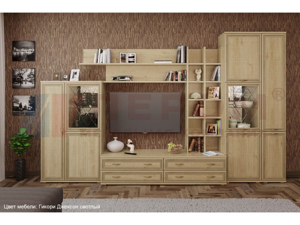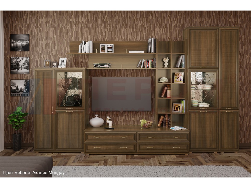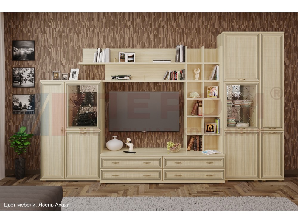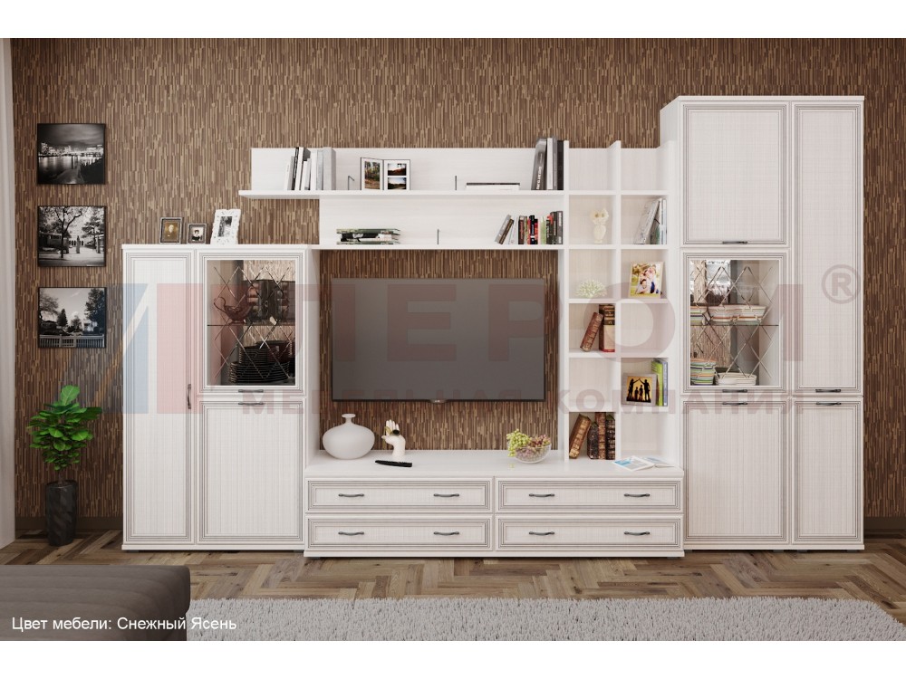 Применяемые материалы: корпус ЛДСП, фасад МДФ.Габаритные размеры: ВхШхГ - 2224х3600х448 мм. Размер ниши под телевизор: ВхШ - 1080х1260 мм.Состав композиции по модулям: ШК-1084, ПЛ-1001, ПЛ-1003, ПЛ-1011, ТБ-1032, ШК-1050, ШК-1042, ЗР-1017, ЗР-1023.Композиция изготавливается в следующих цветовых вариантах:- Снежный ясень (СЯ)- Ясень Асахи (АС)- Гикори Джексон светлый (ГС)- Акация Молдау (АТ)Внимание! Цвета, представленные на дисплее, воспроизведены электронным способом. Они не заменяют оригинальные цвета, так как на восприятие цвета влияют, среди прочих, такие факторы, как структура поверхности, освещение и цвета отделки интерьера. Перед выбором окончательного цвета рекомендуем ознакомиться с мебелью в салонах наших представителей.