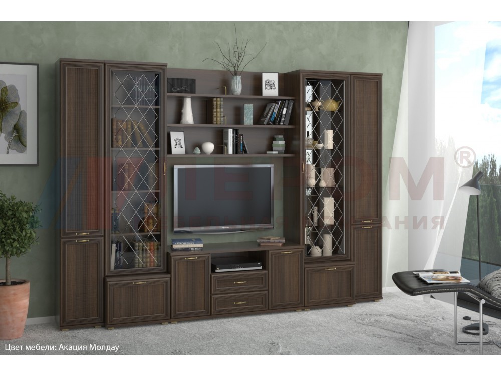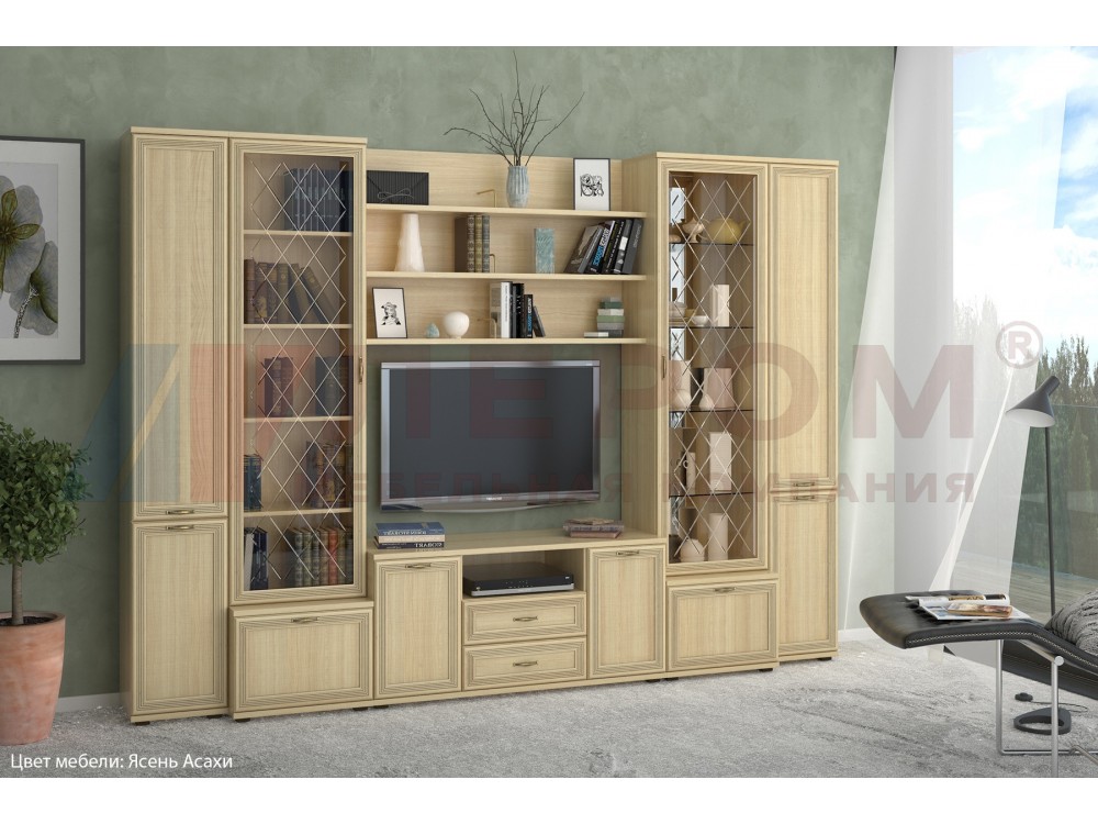 Применяемые материалы: корпус ЛДСП, фасад МДФ.Габаритные размеры: ВхШхГ - 2224х3060х448 мм. Размер ниши под телевизор: ВхШ - 828х1260 мм.Состав композиции по модулям: ШК-1042, ШК-1061, ТБ-1036, ПЛ-1003, ПЛ-1003, ПЛ-1003, ТБ-1022, ШК-1062, ТБ-1036, ШК-1042, ЗР-1011.Композиция изготавливается в следующих цветовых вариантах:- Снежный ясень (СЯ)- Ясень Асахи (АС)- Гикори Джексон светлый (ГС)- Акация Молдау (АТ)