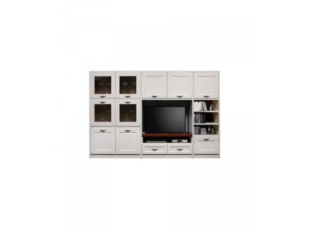 В комбинированном шкафу предусмотрены места для установки телевизора (max 42”), хранения посуды за рамочными дверями с филенками из тонированного стекла (бронза) и других вещей за рамочными дверями, за одним из которых имеется барное отделение, в котором находится металлический держатель для бокалов. Так же имеется три выдвижных ящиках в нижнем ряду шкафа.