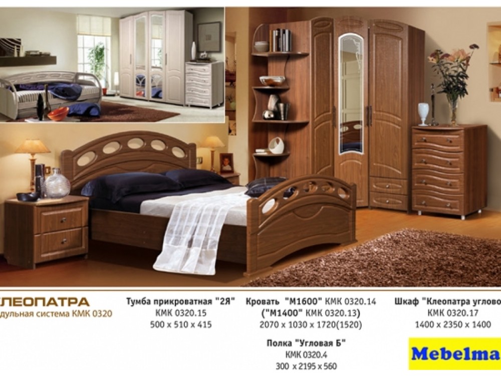 Широкий выбор отдельных модулей позволяет обустроить спальную комнату по вашему вкусу, учитывая особенности планировки. Традиционный набор спальни: кровать, прикроватные тумбы, комод дополнены трёхдверными, четырёхдверными, угловыми шкафами и функциональной нетрадиционной кроватью в виде тахты. Чувственные, плавные линии нашли своё воплощение в наборе "Клеопатра". Все модули спальни идеально гармонируют между собой. Оригинальный рисунок на фасадных деталях всех модулей придаёт мебели необыкновенный вид, стильный современный дизайн. Эти модели отличаются прочностью и надёжностью.