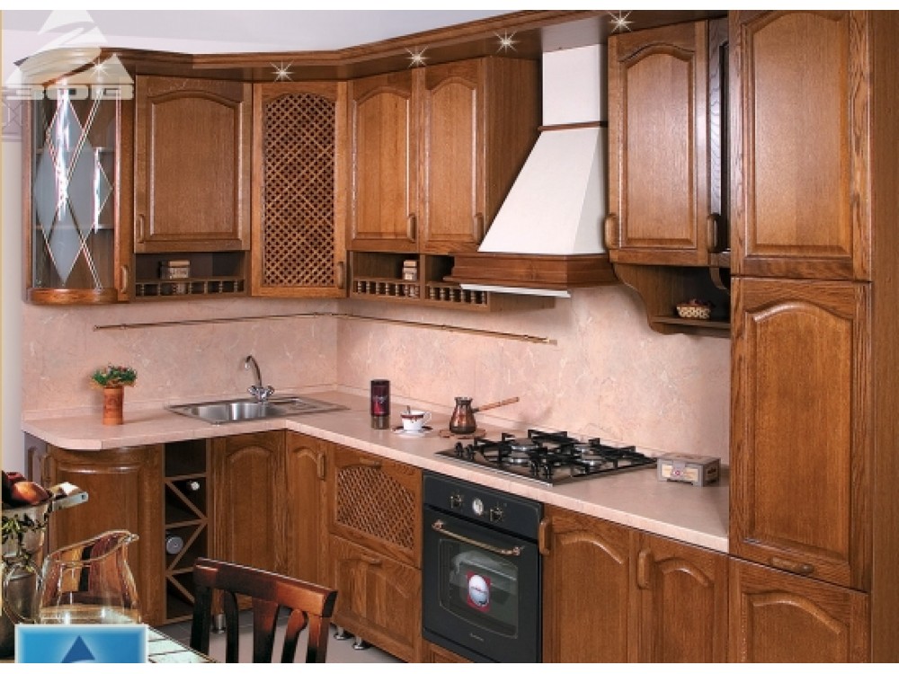Данная модель кухни это прекрасный пример сочетания чарующий старины и современной функциональности. Первое что можно отметить это ее неповторимый дизайн. Широкая и длинная столешница позволит вам с удобством и максимальным комфортом готовить одновременно несколько ваших кулинарных шедевров. Большое количество открытых полок прекрасно подходит для размещения различных кухонных принадлежностей. Так же удачное расположение верхних и нижних шкафчиков позволит вам с большим удобством разместить в них различную посуду. Во все это великолепие органично добавлен шкафчик с витражом. Цвет дуба придает всей кухни вид надежности и прочности. И конечно все это выполнено с традиционно высоким качеством белорусской мебели кухни.