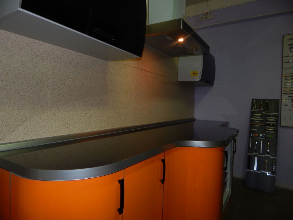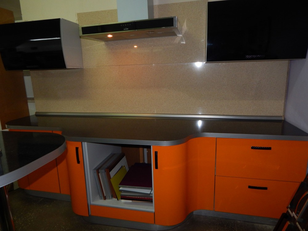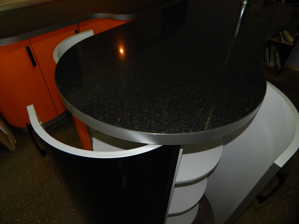Фасад: Пост-6 Цвет: Ночь / Апельсин Каркас: ЛДСП Пепел в кромке ПВХ 16 мм Столешница: "Черная бронза" 38 мм Размер: 3 м + барная стойка 1,6 м